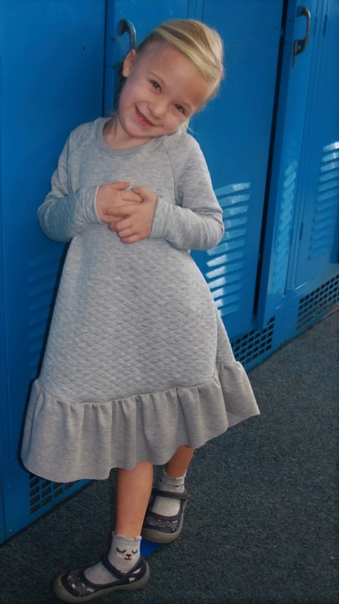 For the winter version, I used a thick, quilted knit for the long sleeves and bodice and another simple solid for the neckband, ruffles, and pocket.